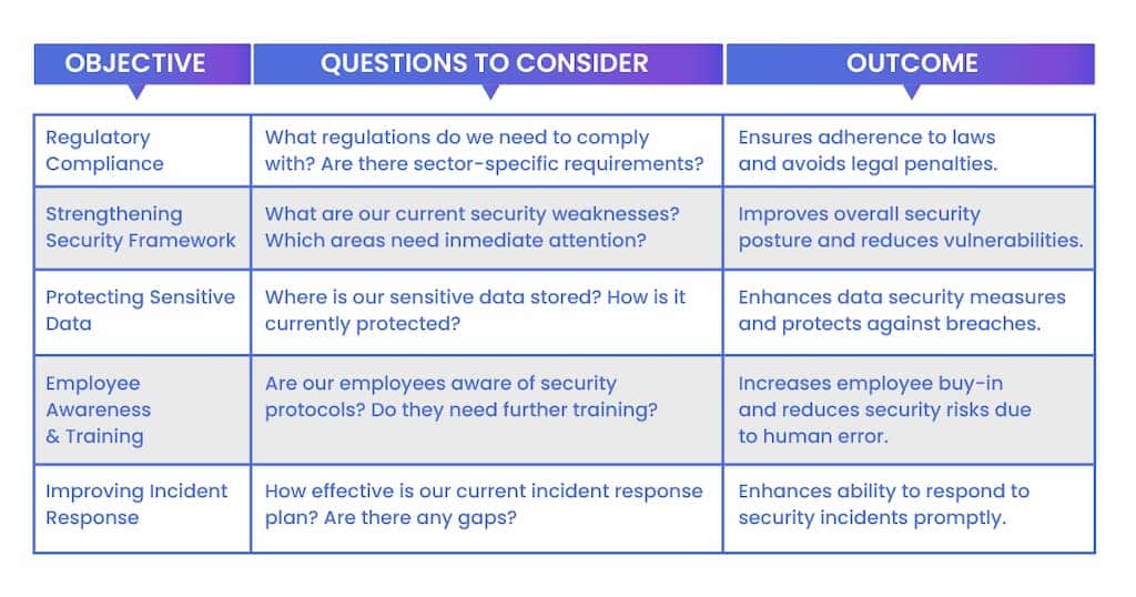 - Compliance Standards: Confirm that your organization’s operations align with relevant regulatory requirements and industry standards. This includes GDPR, HIPAA, ISO/IEC 27001, and other applicable frameworks.