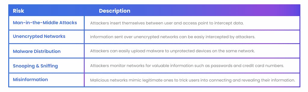 Here’s the catch: Not all public WiFi networks are safe. In fact, the convenience they offer often obscures the multitude of cyber threats they pose. Let’s delve further into some of these risks.