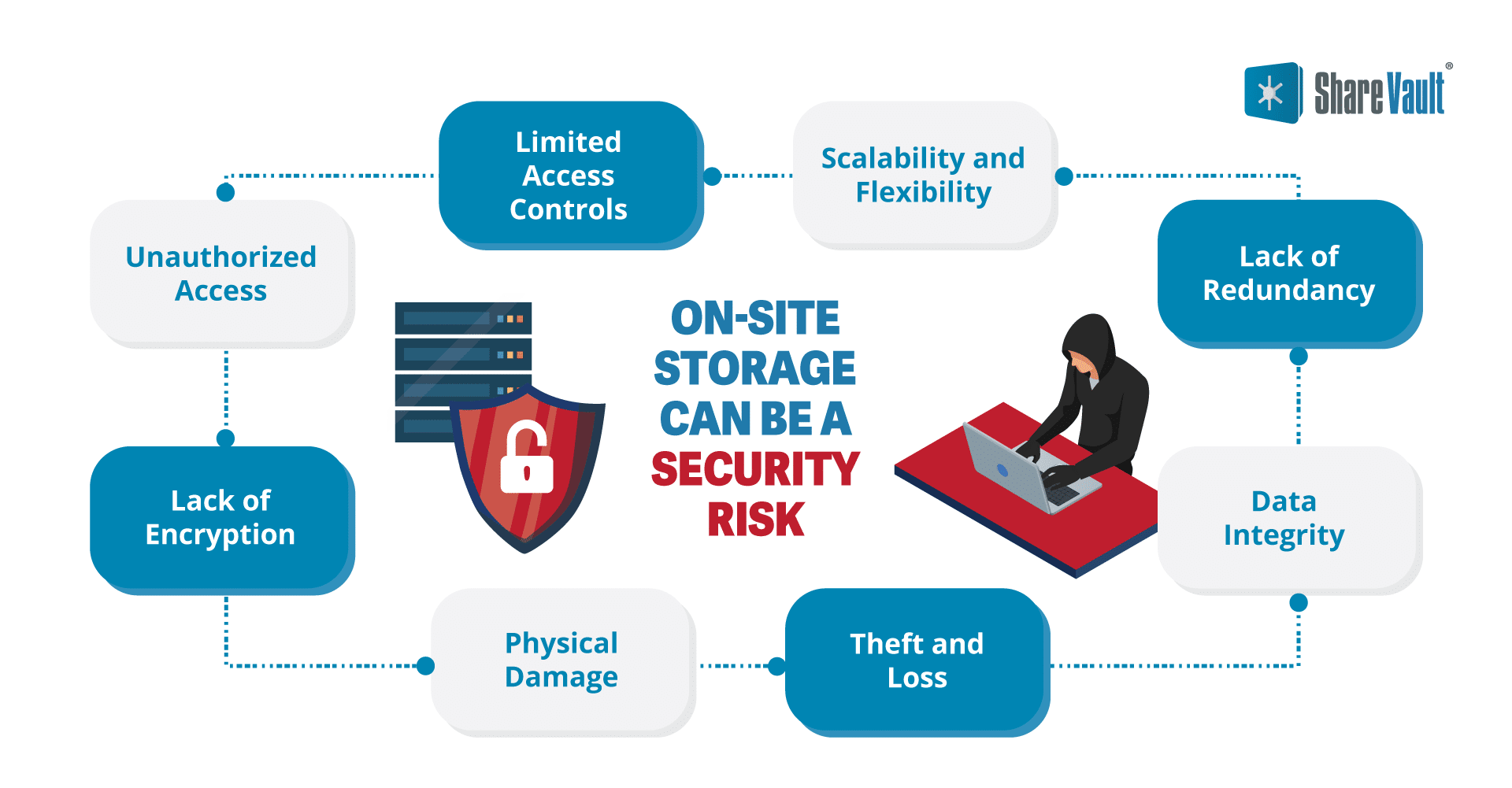 - Unauthorized Access: A physical storage system can be vulnerable to unauthorized access by individuals, due simply to poor staff security protocols or by theft.