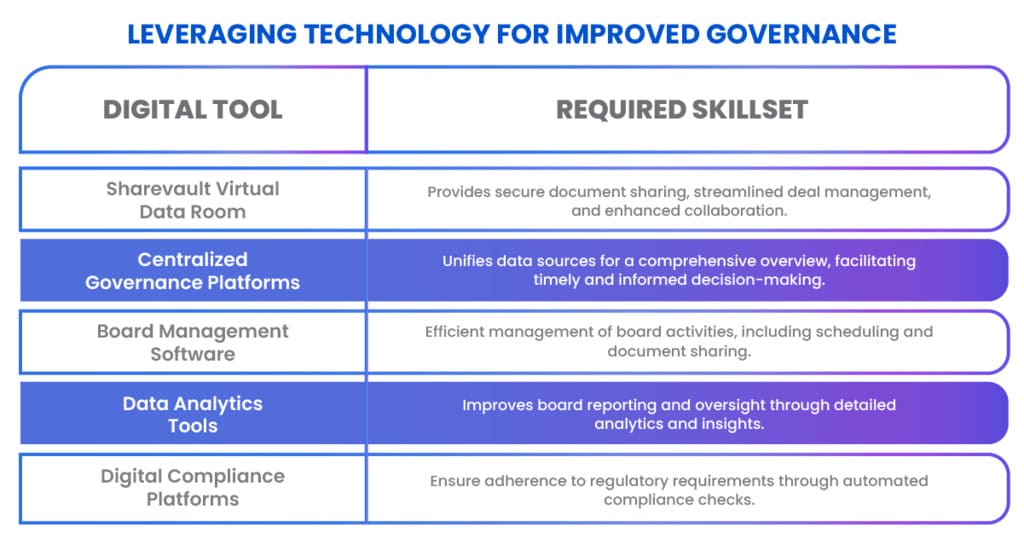 - Technology can be used to enhance transparency, streamline compliance processes, and improve communication and reporting. Tools like data analytics and software platforms help in monitoring performance and ensuring that governance practices are effective and up-to-date.