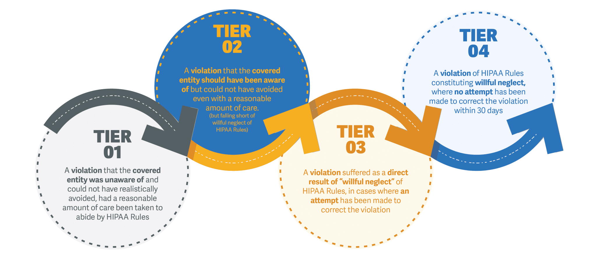- Tier 4: A violation of HIPAA Rules constituting willful neglect, where no attempt has been made to correct the violation within 30 days