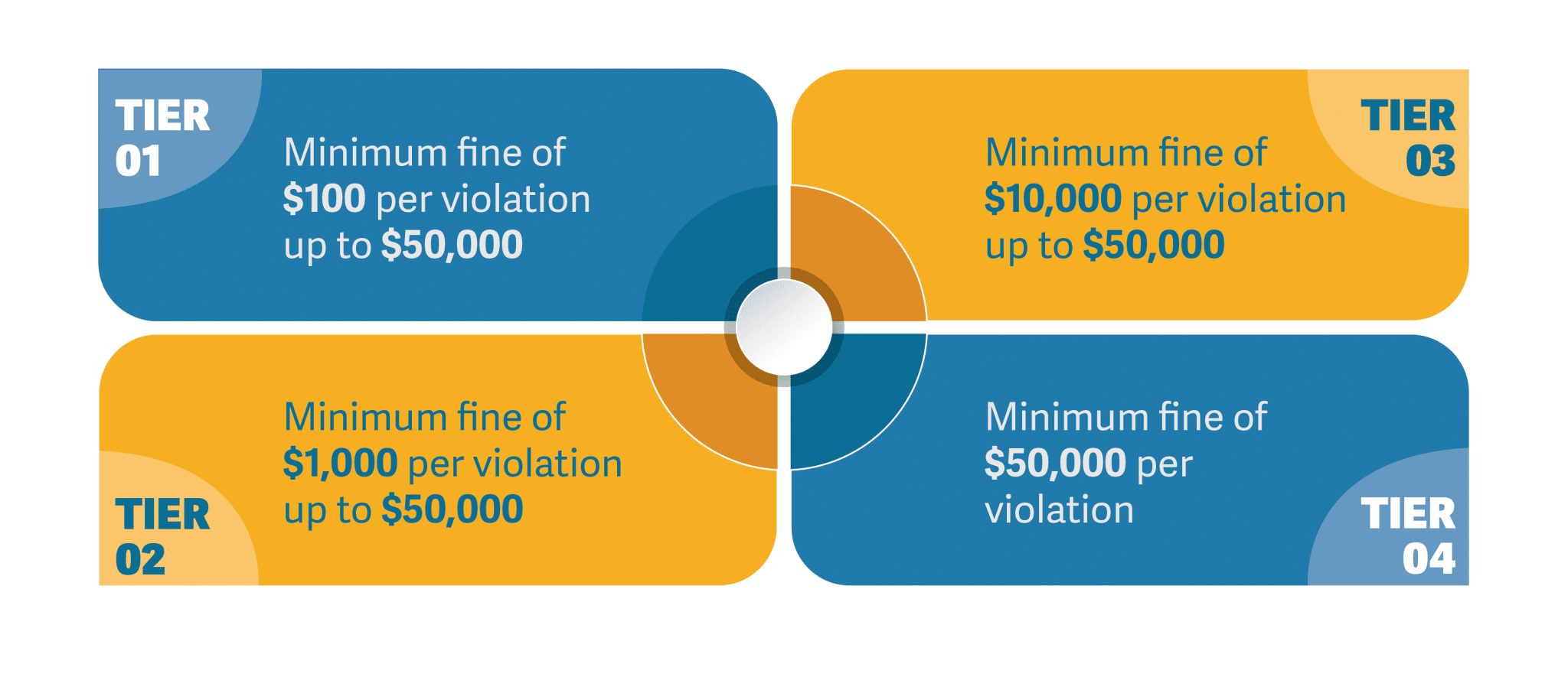 - Tier 1: Minimum fine of $100 per violation up to $50,000