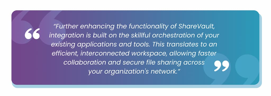 Through a diverse range of seamless integrations, ShareVault works harmoniously with popular productivity suites, like Microsoft Office and Google Drive. This ensures that your habits of organizing files and documents not do have drastically to change.