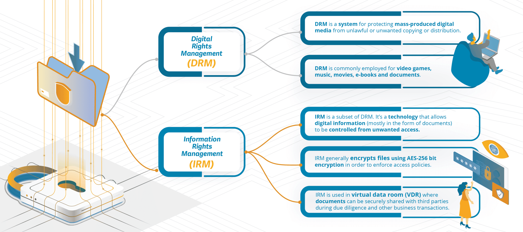 Information Rights Management (IRM) is a subset of DRM. It’s a technology that allows digital information (mostly in the form of documents) to be controlled from unwanted access.